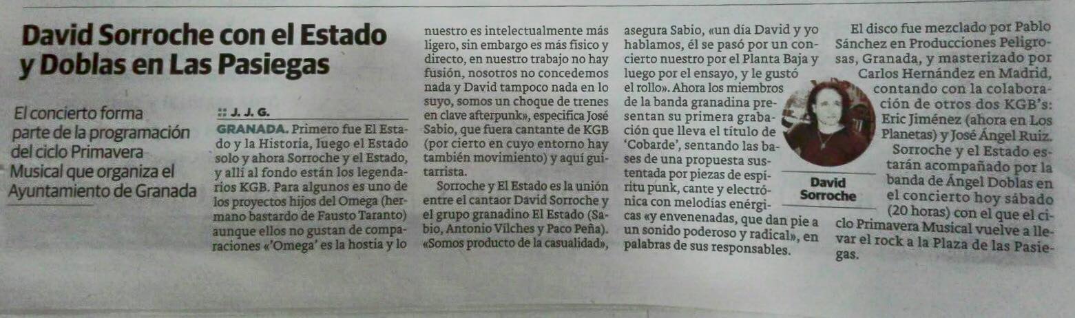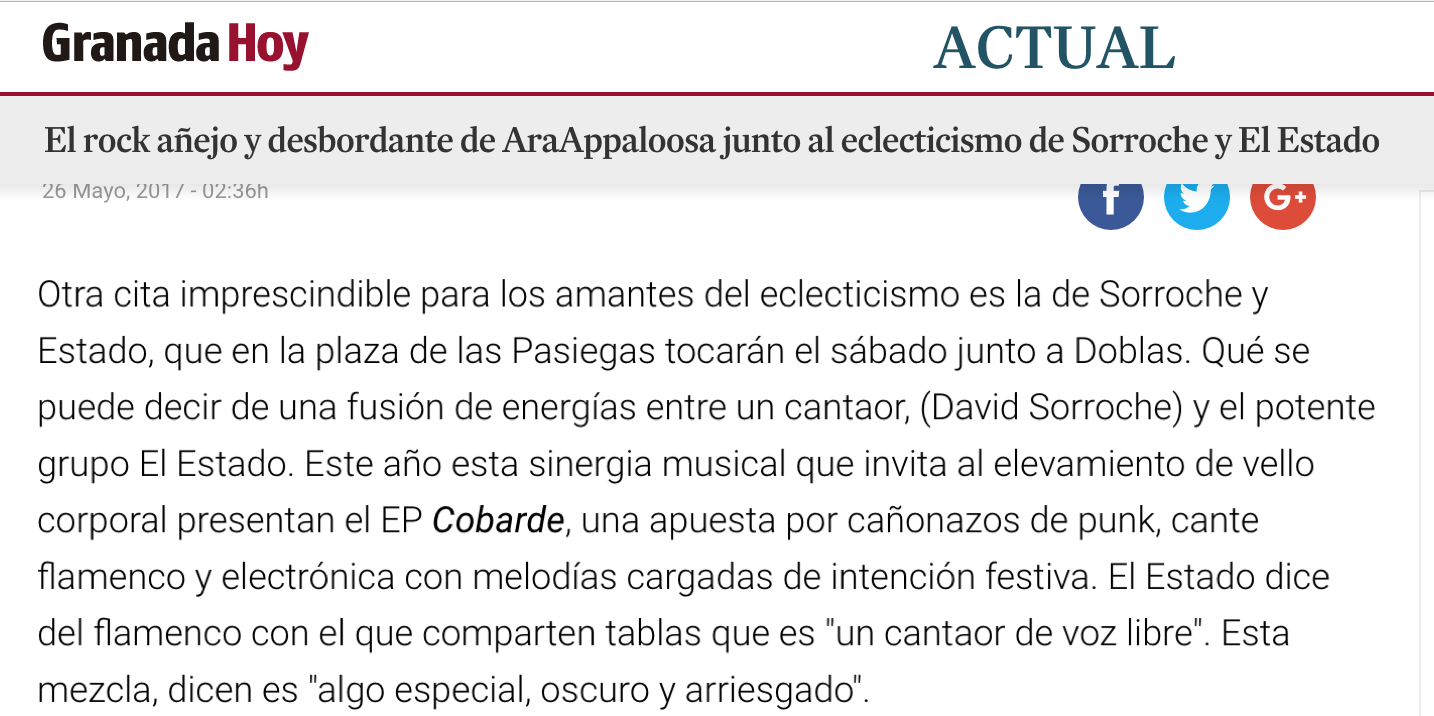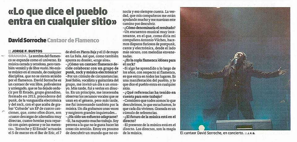- Qué se puede decir de una fusión de energías entre un cantaor, (David Sorroche) y el potente grupo El Estado. Este año esta sinergia musical que invita al elevamiento de vello corporal presentan el EP Cobarde, una apuesta por cañonazos de punk, cante flamenco y electrónica con melodías cargadas de intención festiva. (Granadahoy.com)